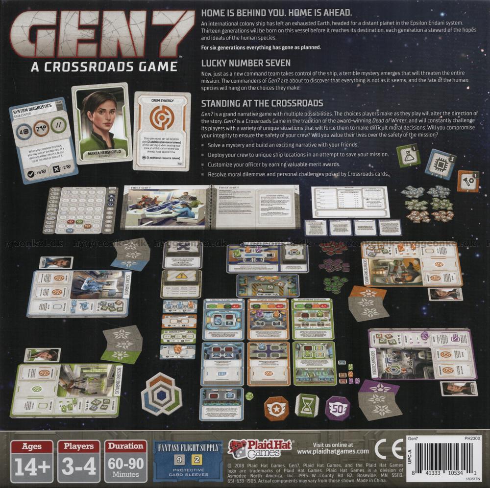 Gen7 är ett stort spel med en omfattande story och mängder av sidospår, och spelarnas val ändrar historiens gång. Gen7 är ett Crossroads Game i stil med Dead of Winter, och det kommer konstant utmana spelarna med en bred arsenal av unika situationer som tvingar dem att göra svåra, moraliska val. Kommer ni äventyra er integritet för att säkra besättningens väl? Är era liv viktigare än att se till att uppdraget lyckas?