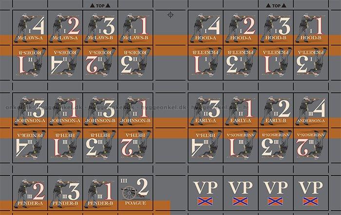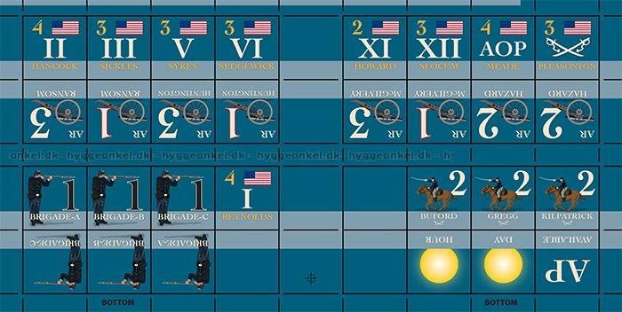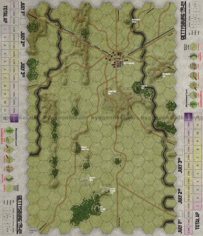 Players will maneuver the counters representing the Union and Confederate armies across a hex cover representation of the battlefield at Gettysburg. Each turn players get a number of action points that will allow them to maneuver, fire combat, and close combat enemy forces. You will always receive some action points, but will never be sure exactly how many recreating the uncertainty of command and control. Victory is obtained by driving the enemy from the field by capturing terrain objectives or eliminating enemy units.