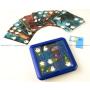 Spelbräde som mäter 15 x 15 cm, genomskinliga brickor och utmaningar.