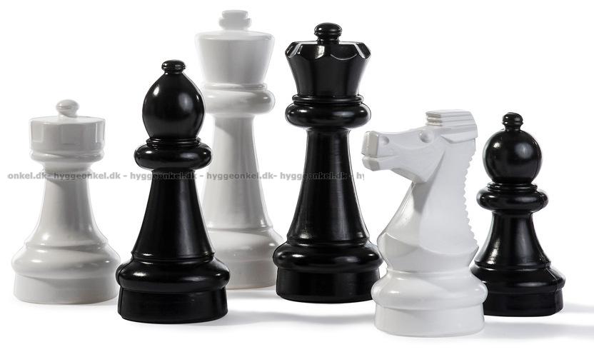 Här är ett set stora och tunga schackpjäser som kan användas både inne och ute. Sätt upp brädet, placera pjäserna och låt spelet börja.