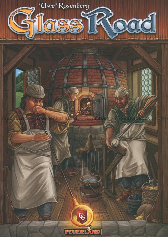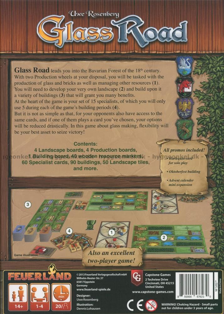 I asken för Glass Road finner du 4 landskapsbräden, 4 produktionsbräden, 1 byggbräde, resursmarker, specialistkort, byggnader, landskapsbrickor med mera.