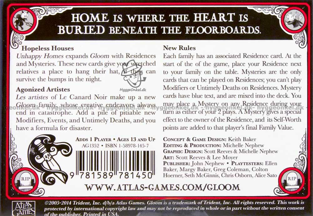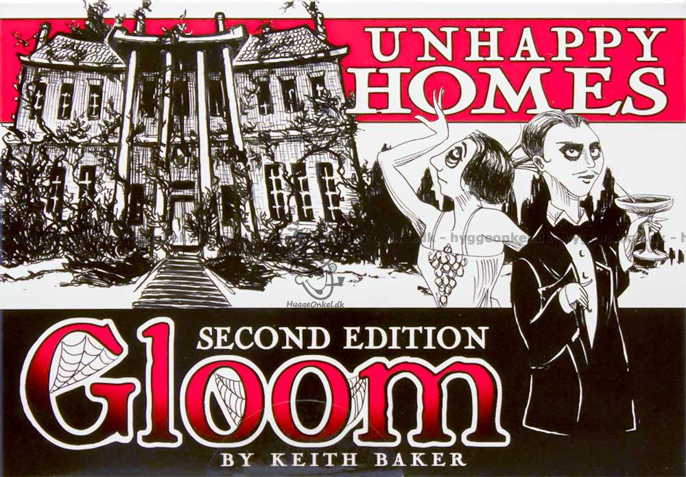 Unhappy Homes ger dig 55 nya kort som du kan blanda in bland dina andra Gloom-kort. Expansionen ger dig också en helt ny familj: Le Canard Noir.