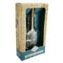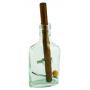 Flaskan är i glas. Innehållet är både i trä och metall. Flaskan mäter 15 x 8 x 3 cm.