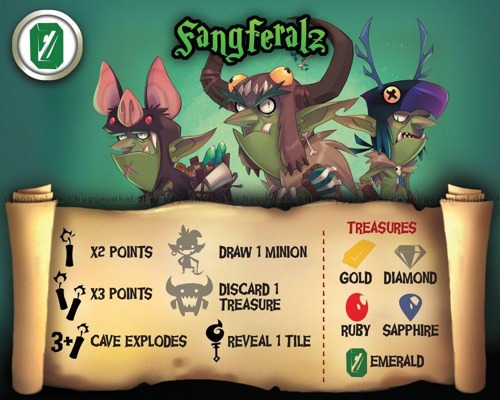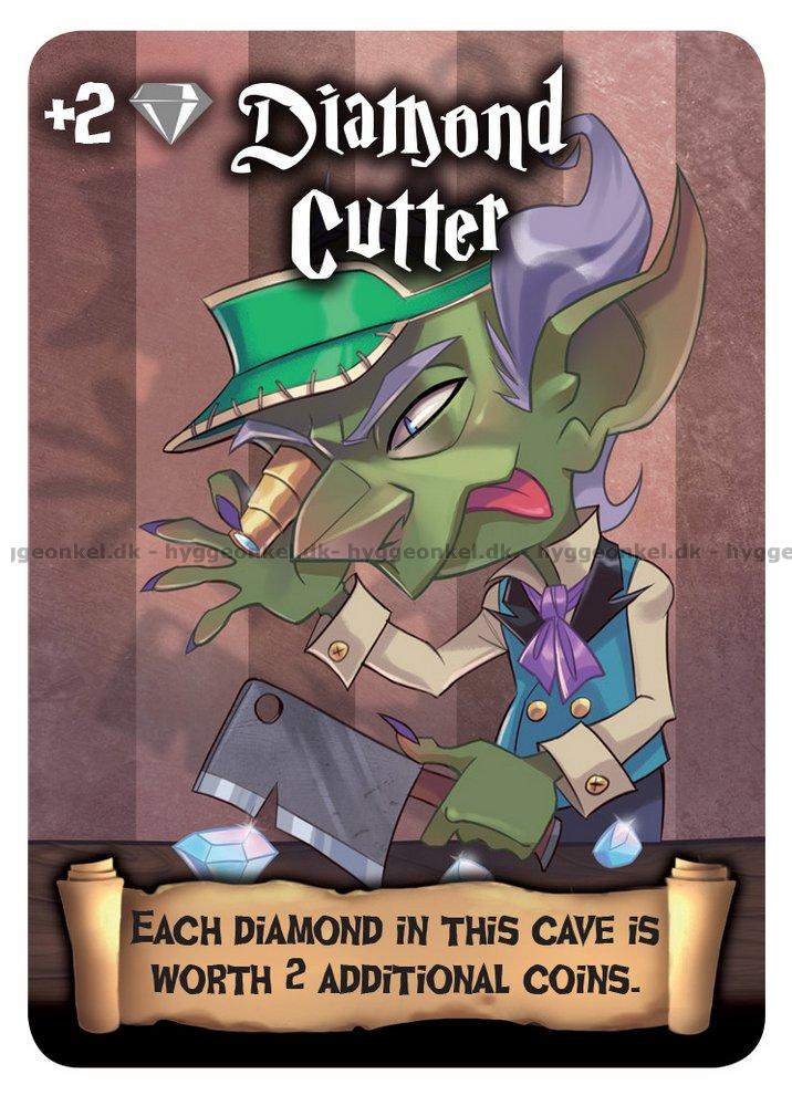 Once everyone has placed all of their goblins (or decided not to place them), players resolve the boards. The goblin on the guildhall draws a minion card that provides a special ability, while each goblin in a cave scores coins based on the gems, diamonds, dynamite and monsters found there; these goblins can also take minion cards if minion tiles have been placed in the cave. Dynamite multiplies the value of a cave, but three or more sticks blows the place up, costing you coins.