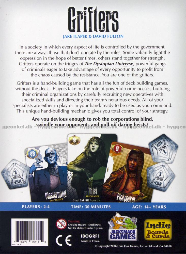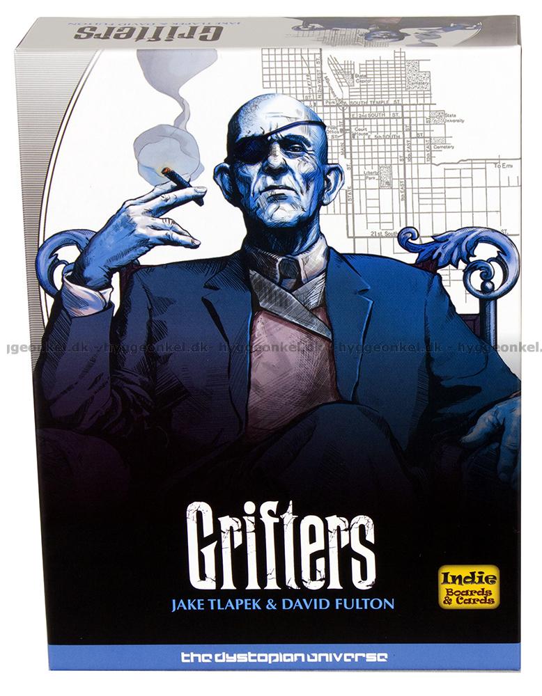 Grifters är ett handbuilding-spel som tar allt det roliga från deck building men samtidigt tar bort själva "decket" ur ekvationen. Spelet utspelar sig i ett dystopiskt samhälle (känt från Resistance och Coup), och spelarna ikläder sig rollerna som mäktiga kriminella ledare. Det löpande uppdraget är att rekrytera nya agenter med specialförmågor och skicka ut dem på ljusskygga operationer. Alla spelarnas agenter är antingen på hand, från vilken de kan skickas ut på uppdrag, eller i spel. Denna unika handbuilding-mekanik ger dig full kontroll över din strategi.