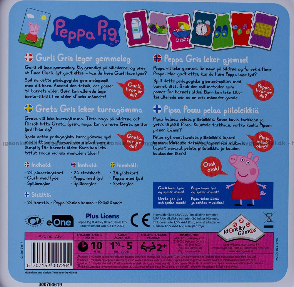 Nu kan ni leka kurragömma tillsammans med Greta Gris. Göm Greta någonstans därhemma och aktivera henne. Efter en liten stund kommer hon att ge ifrån sig ljud.