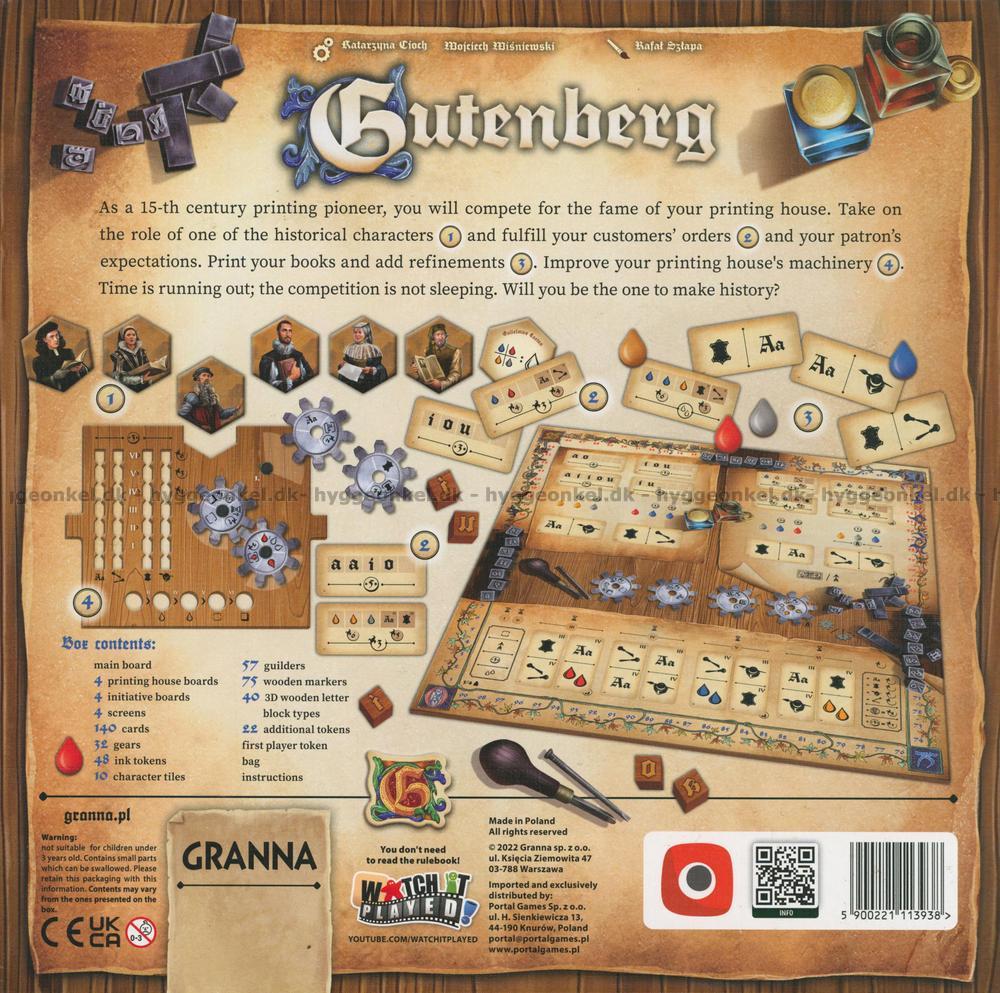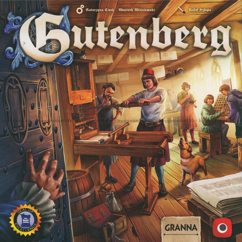 I Gutenberg ska varje spelare styra ett tryckeri och försöka uppnå rikedom och berömmelse genom att utveckla tryckeriets produktionskapacitet och förhoppningsvis få stöd från en mäktig beskyddare.