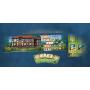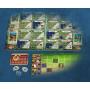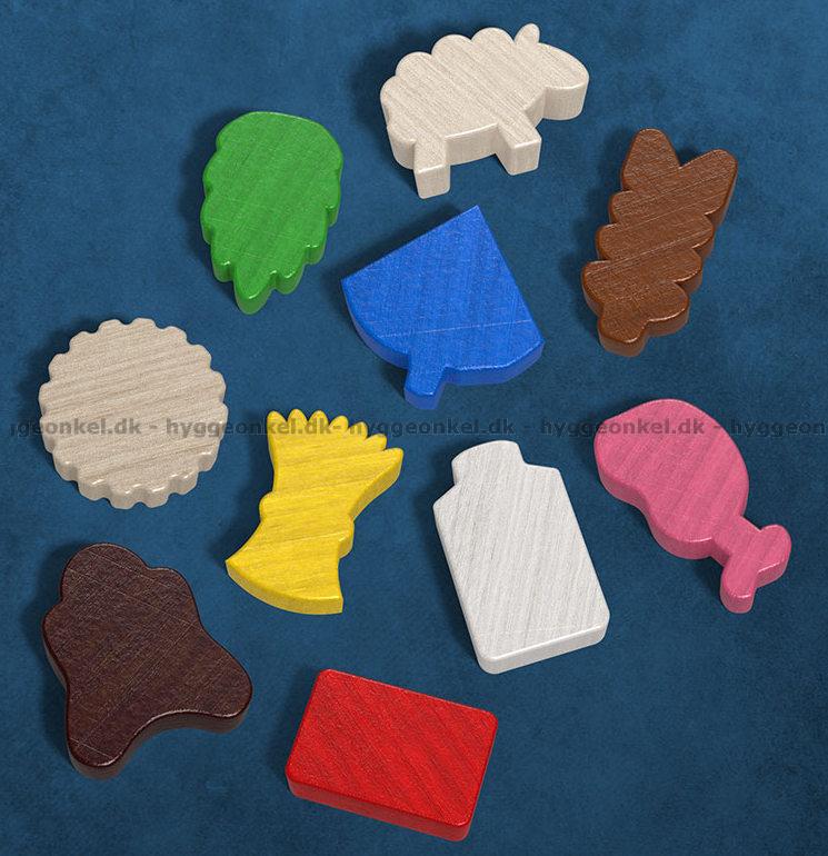 Spelområden, kort, pjäser i trä, marker och poängblock.