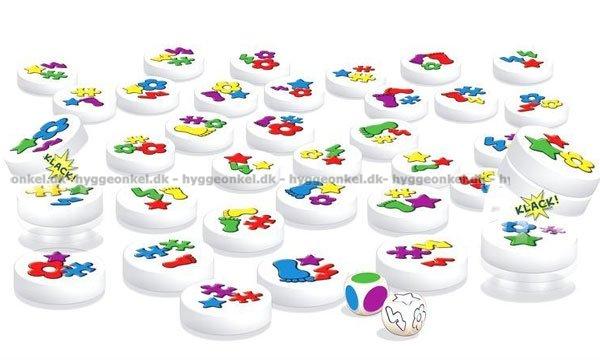 36 runda magnetplattor (cirka 4 cm i diameter och 1 cm i tjocklek), 2 specialtärningar.