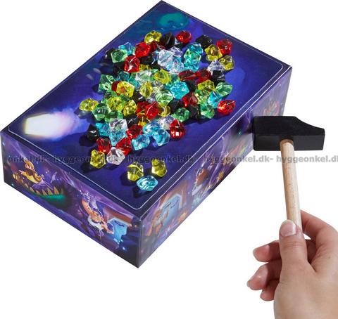 Ädelstenarna placeras ovanpå spelkartongen och med hammaren ska man slå på kartongen tills en ädelsten ramlar av.