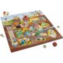 Spelbräde, pjäser i trä, tärning och brickor i kartong.
