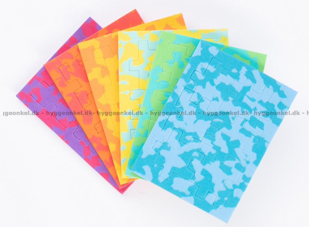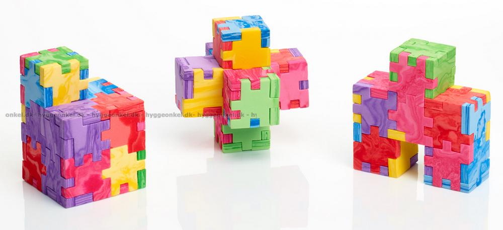 6 skumkuber. Varje kub består av 6 delar. Kuberna mäter cirka 4 x 4 cm när de är ihoppusslade.
