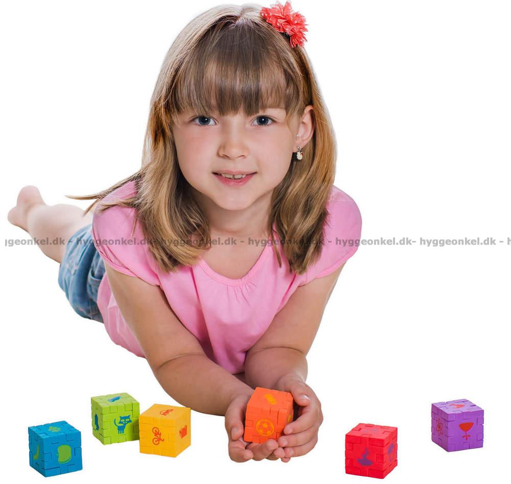6 skumkuber. Varje kub består av 5 delar. Kuberna mäter cirka 4 x 4 cm när de är ihoppusslade.