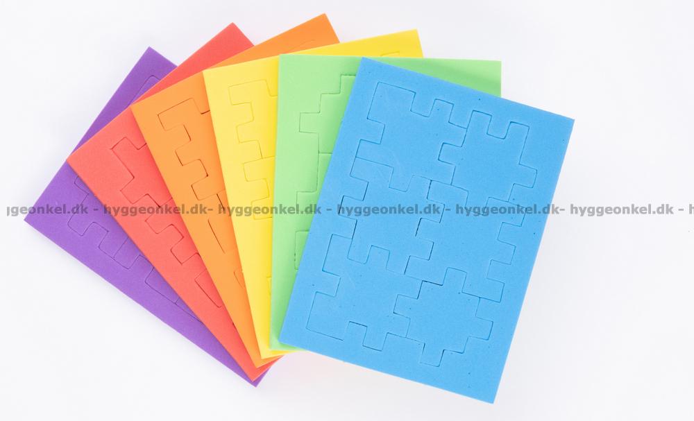 6 skumkuber. Varje kub består av 6 delar. Kuberna mäter cirka 4 x 4 cm när de är ihoppusslade.
