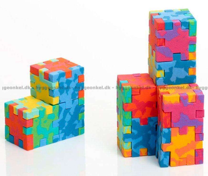 6 skumkuber. Varje kub består av 6 delar. Kuberna mäter cirka 4 x 4 cm när de är ihoppusslade.