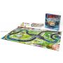 Dubbelsidigt spelbräde, kort, brickor och en racerbil.