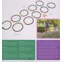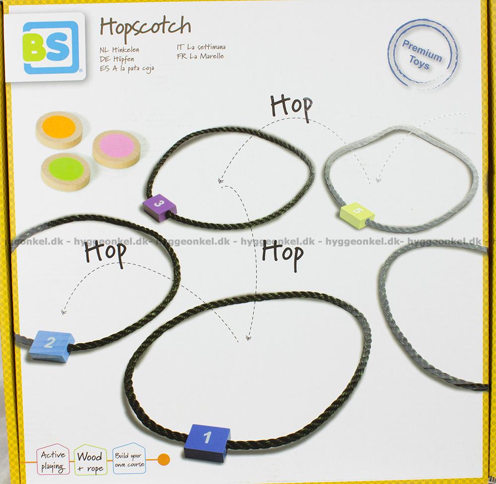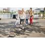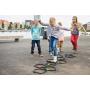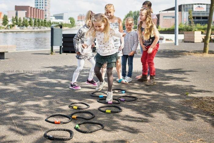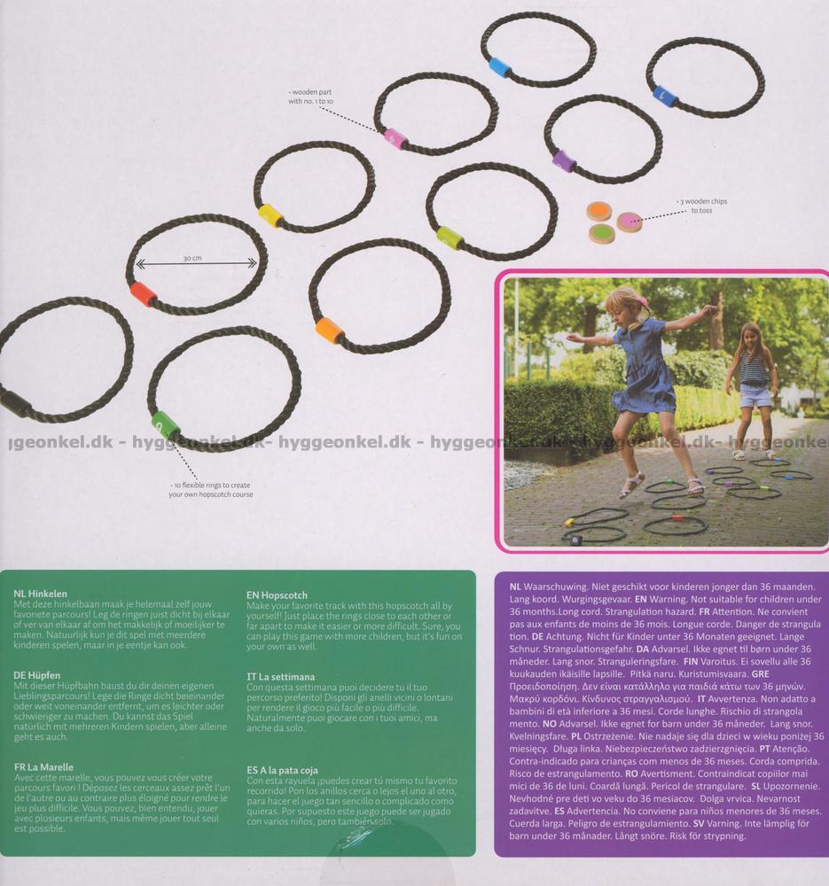 10 stora ringar - varje ring har en diameter på 30 cm - så det finns gott om plats för fötterna. På varje ring finns en målad kloss med ett nummer. Färgerna är olika, vilket gör att de minsta också kan vara med även om de inte kan siffrorna.