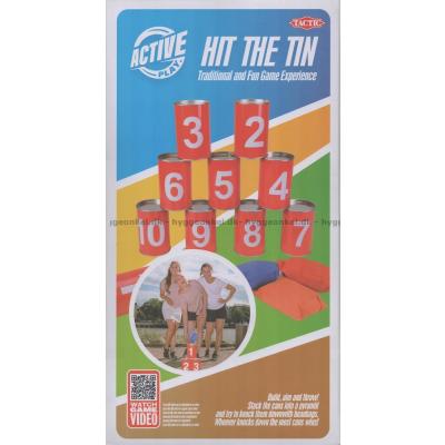 Här får du 10 metallburkar och 3 påsar att kasta med.