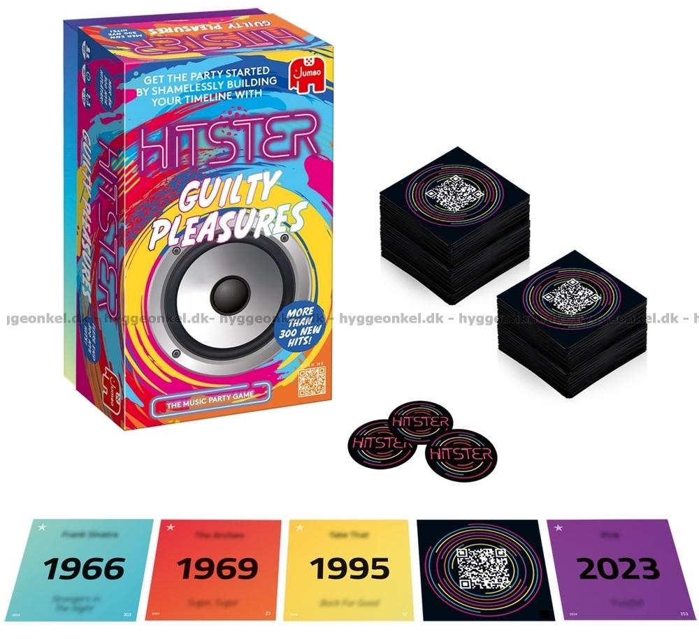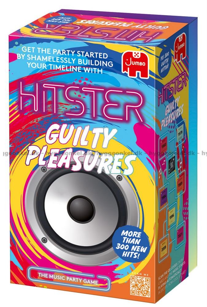 Hitster: Guilty Pleasures skiljer sig från vanliga Hitster genom att fokusera på de roliga och nostalgiska "guilty pleasure"-hitsen som vi alla känner igen och älskar. Med mer än 300 ikoniska låtar ger denna utgåva en extra dos feststämning och minnen. Reglerna är desamma, men låtvalet gör spelet ännu mer underhållande och skapar en fest där alla kan sjunga med och njuta av musiken.
