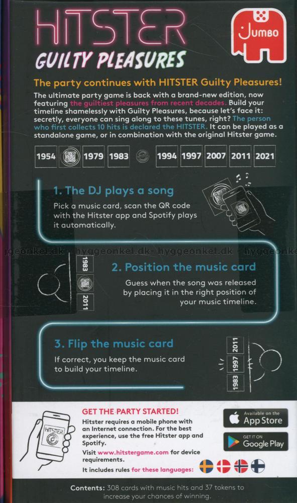 HITSTER: Guilty Pleasures har mer än 300 "guilty pleasures", och det är superenkelt att komma igång. Du behöver inte vara musikexpert för att spela, men dina chanser ökar om du kan namnge artister och låttitlar. Spelet kan också spelas som ett lag eller ensam för en mindre tävlingsinriktad upplevelse.