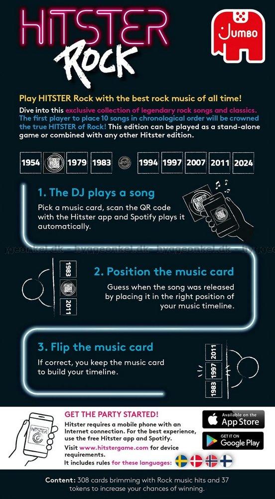 Hitster: Rock skiljer sig från vanliga Hitster genom att fokusera på rockhits som vi alla känner igen och älskar. Med mer än 300 ikoniska låtar ger denna utgåva en extra dos feststämning och minnen. Reglerna är desamma, men låtvalet gör spelet ännu mer underhållande och skapar en fest där alla kan sjunga med och njuta av musiken.