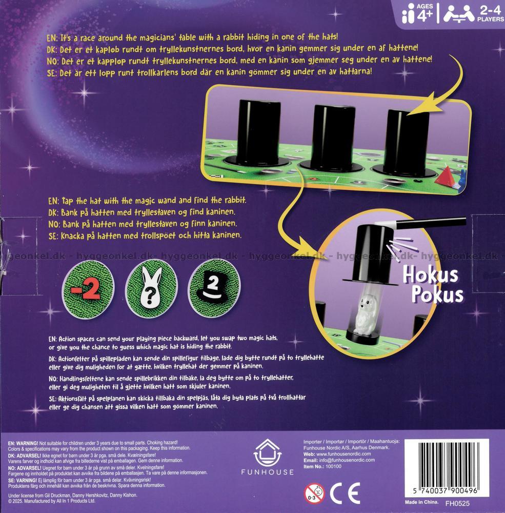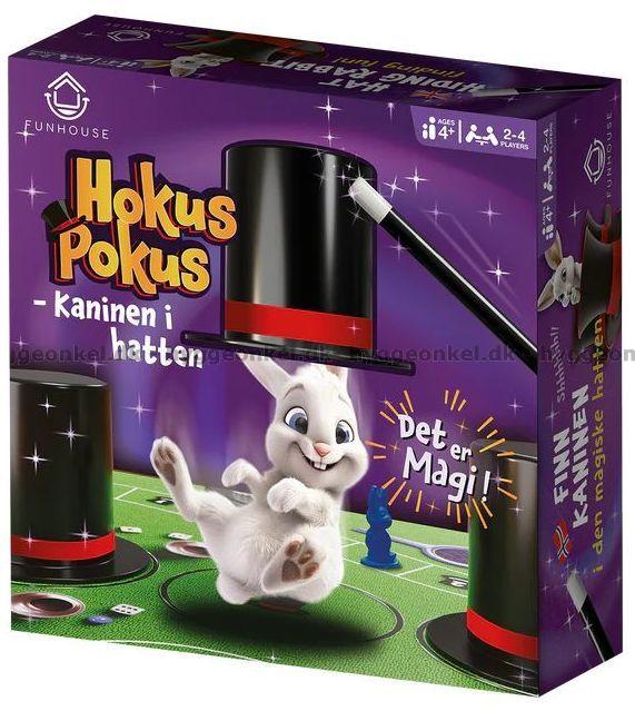 Följ med på en förtrollande resa runt trollbordet i Hokus Pokus: Kanin i hatten – ett magiskt barnspel fyllt med skoj, spänning och skratt. Här gäller det att hålla tungan rätt i mun, för kaninen gömmer sig under en av de tre hattarna, och bara de mest uppmärksamma spelarna kan följa med i var den försvinner. När tärningen rullar rör du dig runt på spelplanen, och vissa rutor ger dig chansen att gissa var kaninen gömmer sig, medan andra blandar hattarna på nytt.