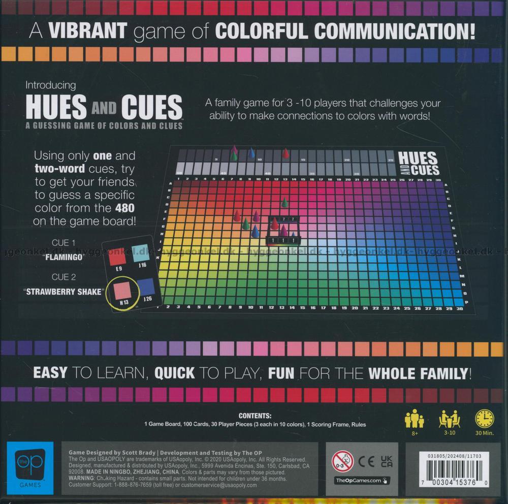Hues and Cues är lätt att lära sig och snabbt att spela, men rymmer oändliga kombinationer och massor av skratt eftersom alla uppfattar färger olika. Det är ett spel som utmanar dina associationsförmågor och får spelare i alla åldrar att upptäcka hur andra ser världen och skapar roliga ögonblick när en gissning är precis i närheten – eller helt fel.