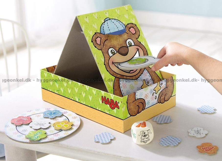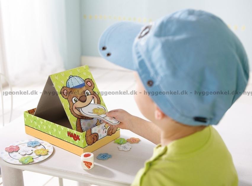 Hjälp varandra att ge björnen mat. Tärningen visar vilken av rätterna som björnen ska äta.