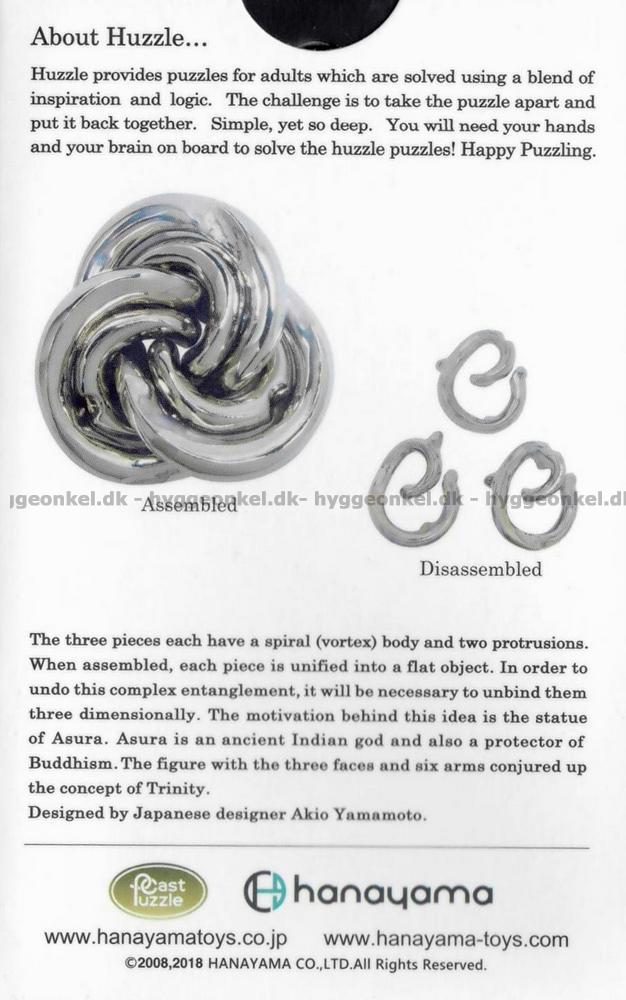 Vortex består av tre delar, som var och en har en spiralformad kropp och två utsprång. När de sätts ihop, förenas de till en platt form, men bakom det enkla yttre döljer sig en komplex sammanflätning. För att lösa utmaningen måste du separera delarna i tre dimensioner och hitta den exakta rörelsen som kan frigöra dem från varandra.