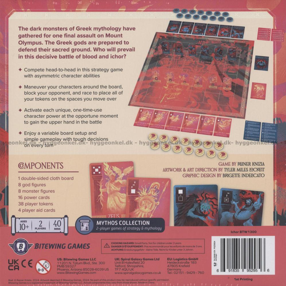 Ichor är ett asymmetriskt strategispel för två spelare där de grekiska gudarna och mytologins mörka monster möts i en sista uppgörelse om Olympen. Den ena spelaren styr gudarna och den andra styr monstren. Båda kämpar om att dominera slagfältet med listiga rörelser och väl valda förmågor.