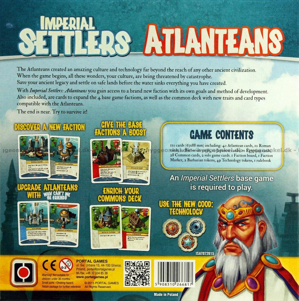 Imperial Settlers: Atlanteans är en expansion som fordrar att du har grundspelet sedan tidigare. Expansionen innehåller ett nytt fraktionsbräde samt teknologi-marker och expansionskort för övriga spelare.