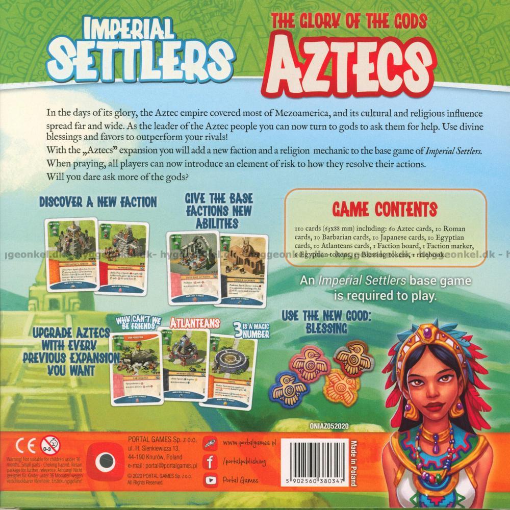 Imperial Settlers: Aztecs är en expansion och det fordras att du har grundspelet Imperial Settlers för att kunna spela det. Expansionen innehåller ett nytt fraktionsbräde, nya resurser och en sjätte fraktion till Imperial Settlers.