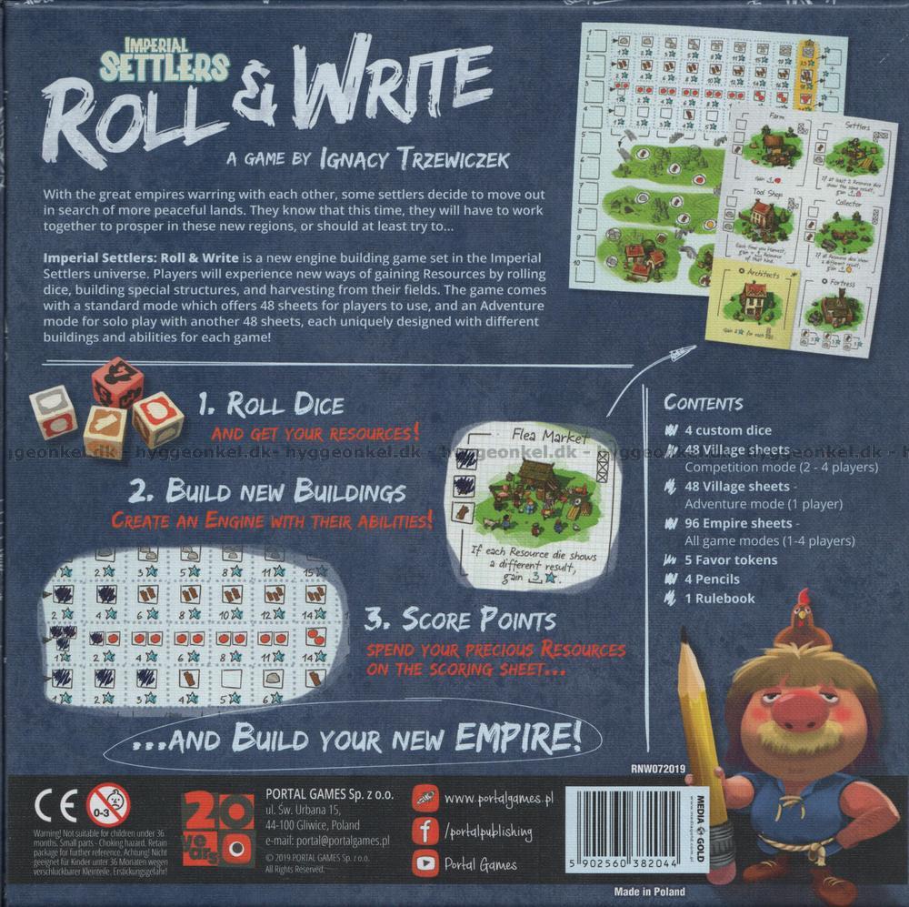 Imperial Settlers: Roll & Write är ett snabbt "engine building-spel" med "roll and write"-mekanismer. Det betyder att varje spelare, på det mest effektiva sättet, ska försöka använda de resurser och de arbetare som man har till rådighet. Spelarna konstruerar nya byggnader, som ger dem nya möjligheter till handlingar, bygger broar, så de kan få del av nya landområden, och uppför olika byggnadsverk för att få poäng.