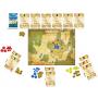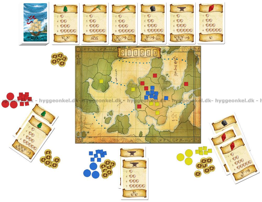 Kartongen innehåller träkuber, dubbelsidigt spelbräde, kort, myntbrickor, varubrickor samt svenska spelregler. Reglerna är på endast fyra sidor så du kan komma igång på nolltid!