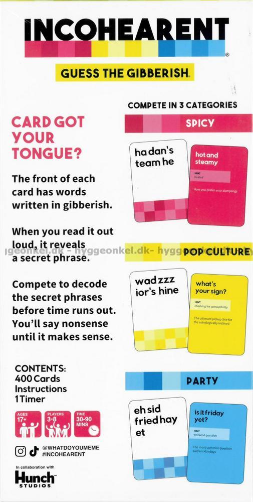 I Incohearent står på varje kort några ord eller en fras som innehåller ett dolt meddelande. Detta meddelande kommer (kanske) fram när orden sägs högt.
