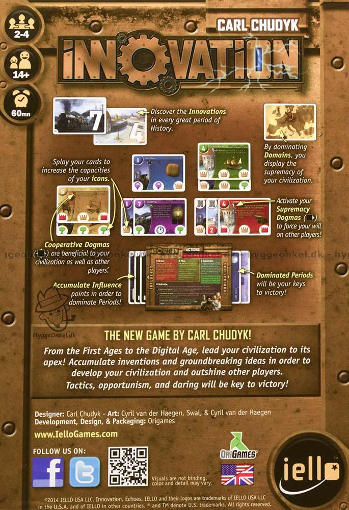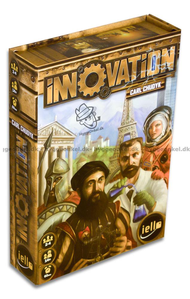 Asken för Innovation inkluderar kort, fyra små spelbräden med en snabb regelöverblick samt spelregler på engelska.