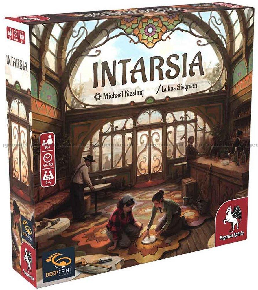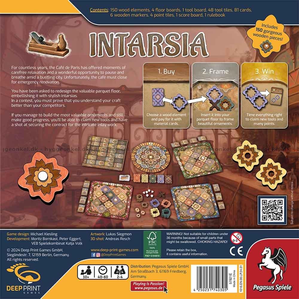 Intarsia är ett strategiskt brädspel där spelarna tävlar om att skapa de mest eleganta mönstren av träintarsia för att vinna det prestigefyllda uppdraget att dekorera det berömda Café de Paris.