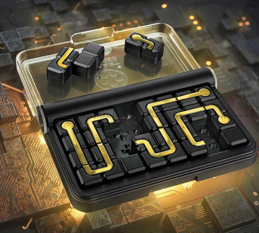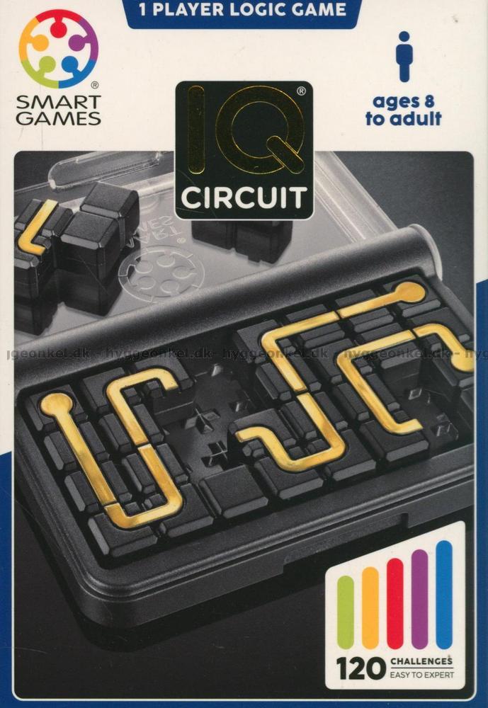 I IQ Circuit ska man placera de 10 brickorna på plattan, så att de passar med uppgiften i häftet.
