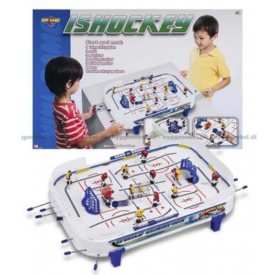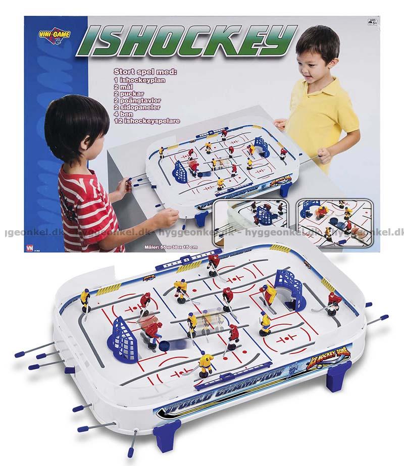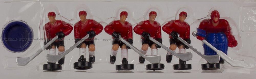 2 mål, 2 puckar, 2 poängtavlor, 2 sidopaneler, 4 ben, 12 ishockeyspelare (6 cm. hög).