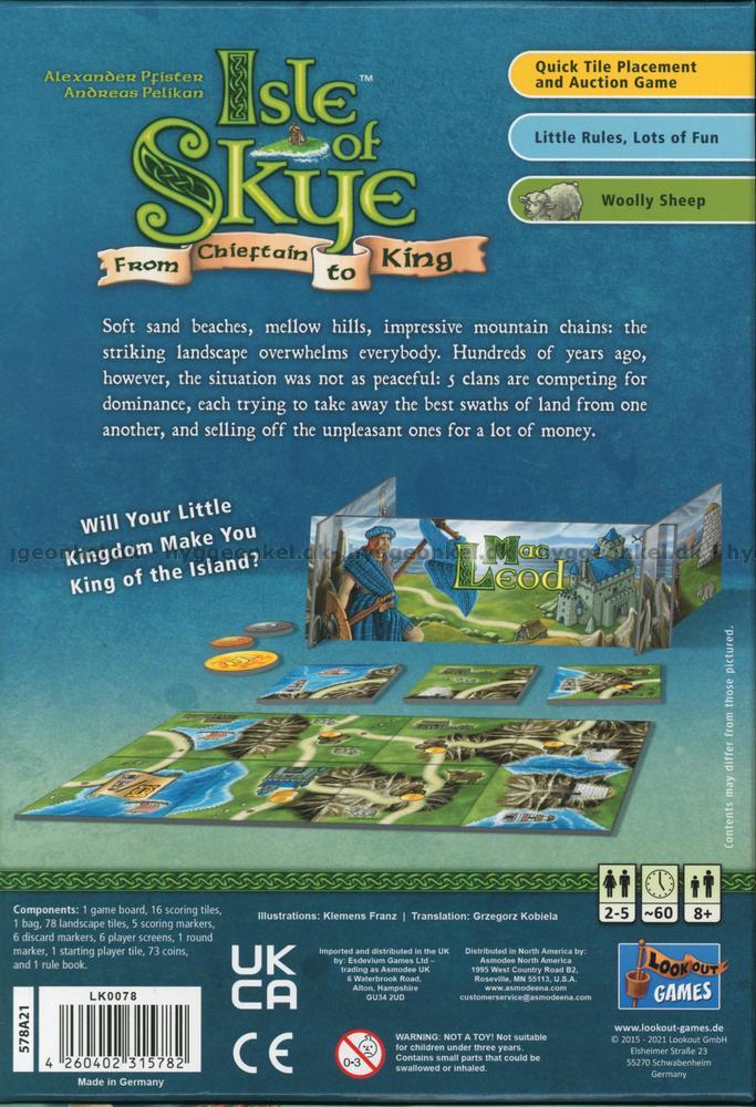 I Isle of Skye: From Chieftain to King, som är ett slags brickspel för 2-5 spelare, är du hövding för en mäktig klan. Du har en önskan om att expandera ditt rike och vinna så många poäng som möjligt - men i varje spelomgång är det bara 4 av 16 poängbrickor som ger poäng.