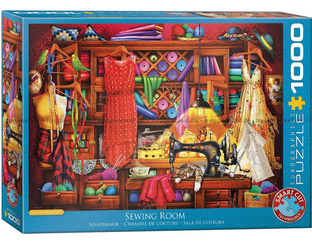 - I det stora skåpet bakom finns alla möjliga färgglada tyger
