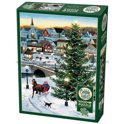 - Mitt i den snötäckta staden pryder en vacker julgran stadens torg