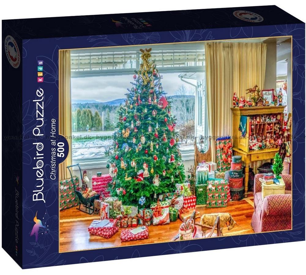 - En överdådigt dekorerad julgran står centralt i vardagsrummet, omgiven av färgglada paket och juldekorationer. Stämningen är varm och inbjudande, med en touch av traditionell jul.