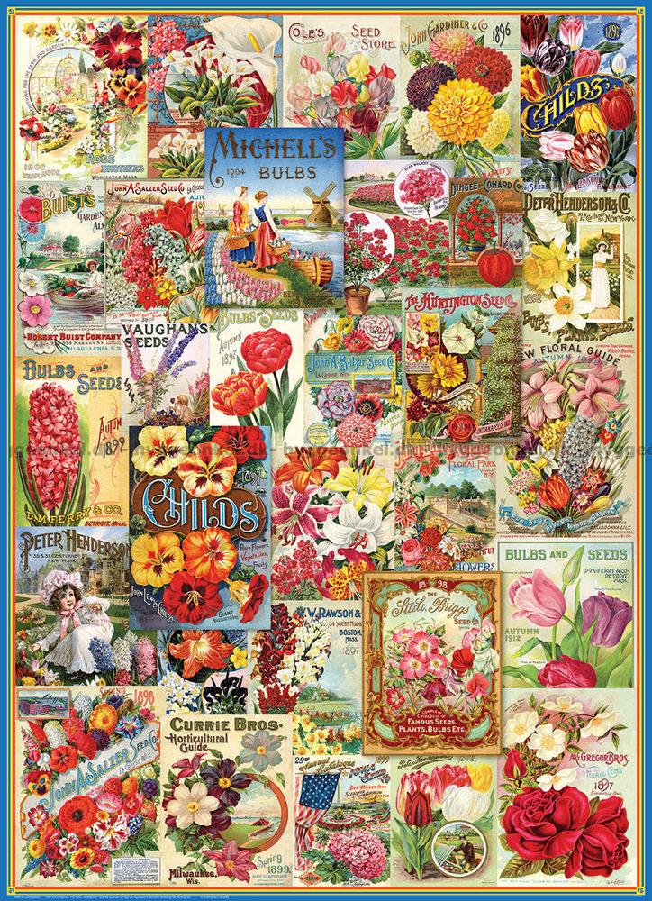 - Snygg collage med färgglada blommor. Varje paket är detaljerat illustrerat med olika blomarter och färger