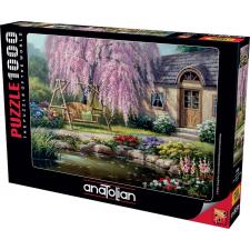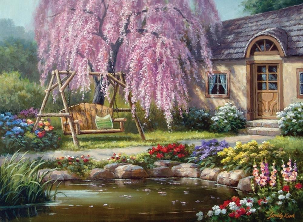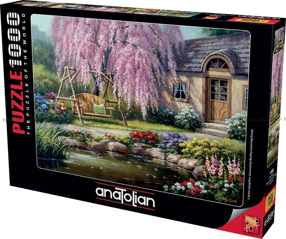 - Framför huset står ett stort körsbärsträd bredvid trägungstolen
