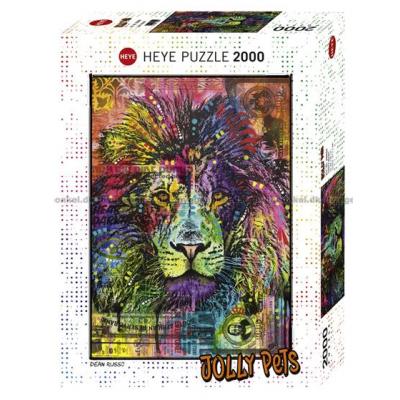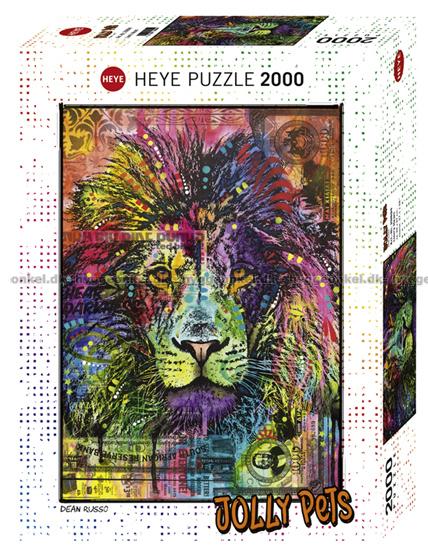 - En majestätisk lejon med en färgstark och konstnärlig man. Lejonets ansikte är i centrum, och dess intensiva ögon fångar genast uppmärksamheten. Bakgrunden är fylld med en blandning av färgglada mönster och texturer