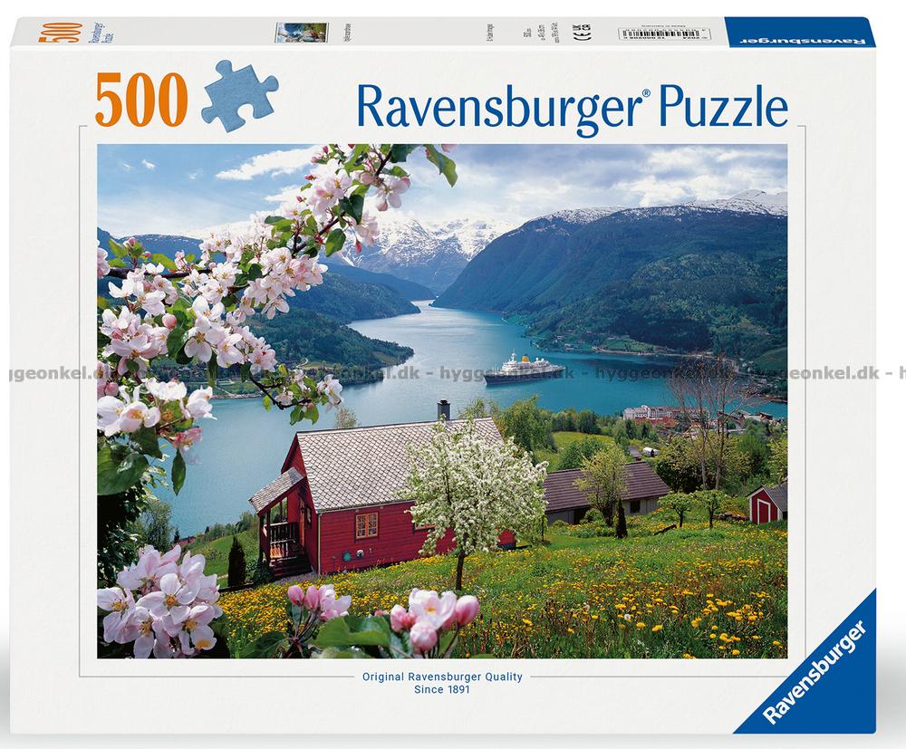 - En fin utsikt in i den stora fjorden. I förgrunden ligger en röd trästuga omgiven av blommande träd