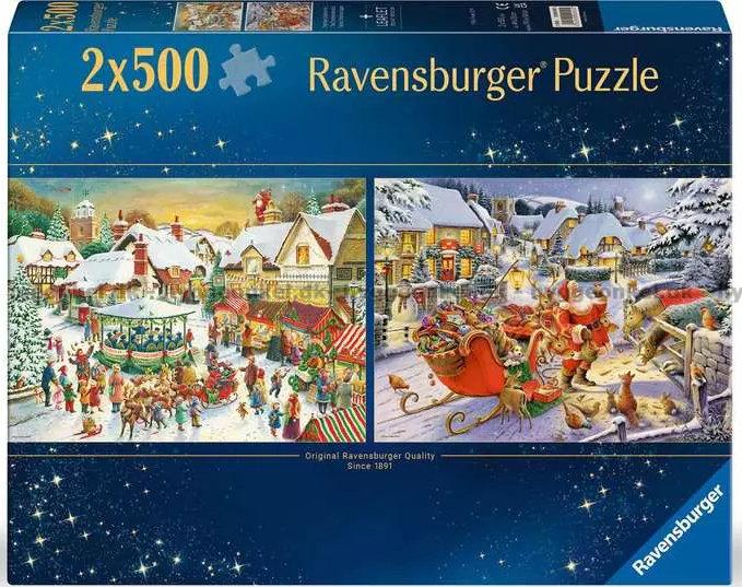 - På det ena pusslet kan du följa med till en mysig julmarknad. På det andra motivet myser jultomten med djuren.