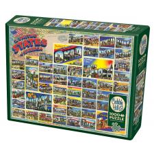- En samling färgglada vykort från olika amerikanska delstater, arrangerade i ett rutmönster. Varje vykort har namnet på en delstat och innehåller ikoniska bilder från den aktuella regionen