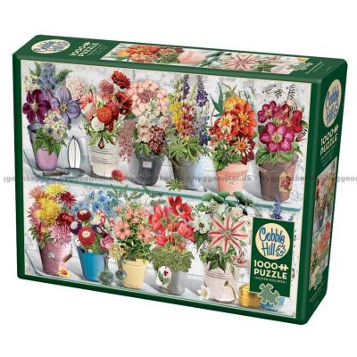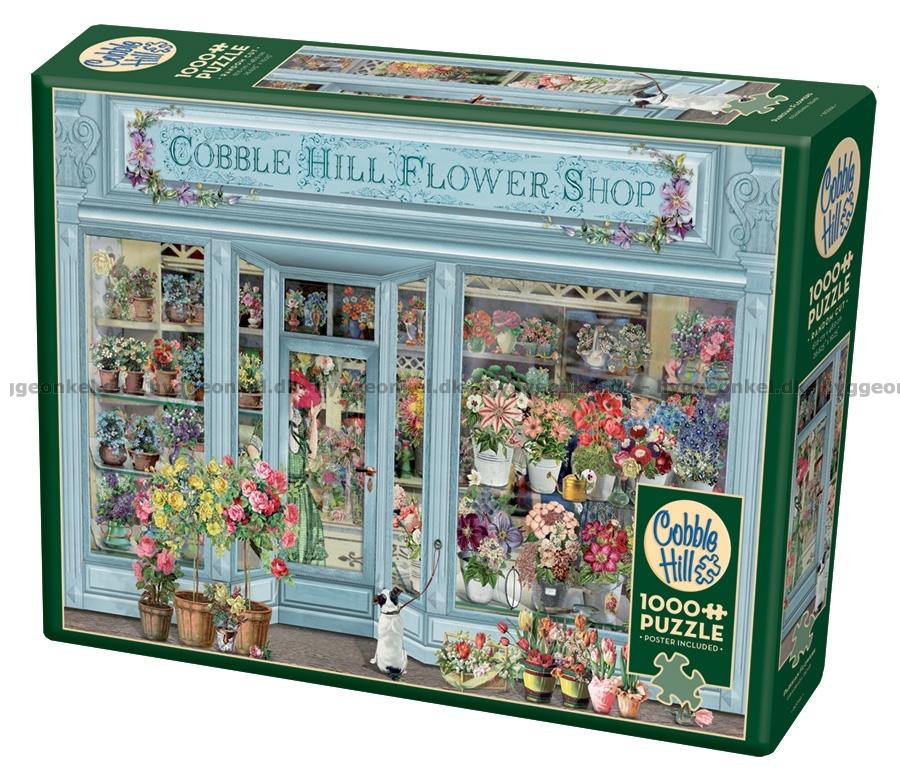 - En charmig blomsteraffär med ett överflöd av färgglada blommor som fyller fönstren. I fönstren syns ett rikt urval av blommor i regnbågens alla färger. Det finns både stora buketter och små krukväxter.